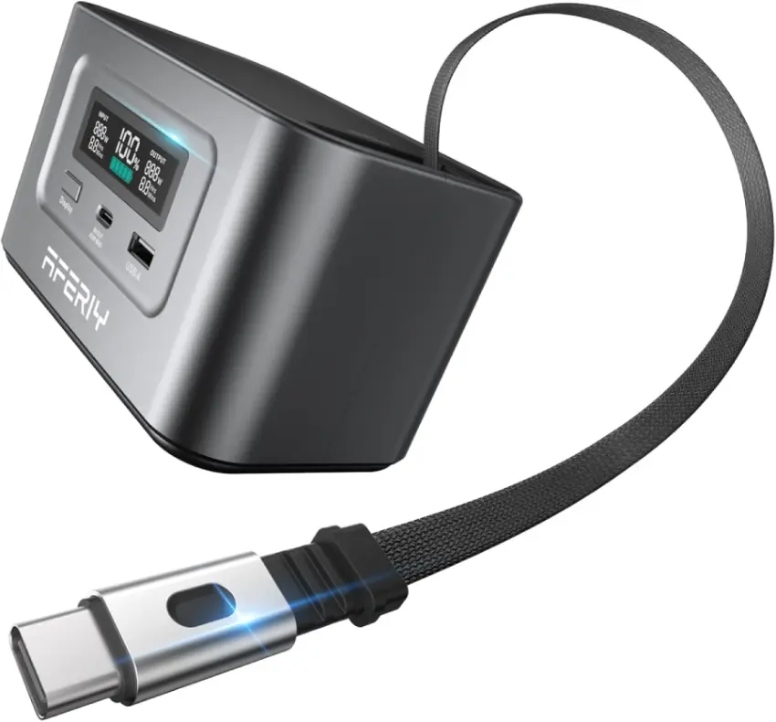 Batterie externe compacte et légère (1,1 kg) de 99,2 Wh, avec câble USB‑C PD 100 W rétractable de 0,8 m pour charger et recharger sans câble supplémentaire. Elle propose plusieurs modes de charge rapide (jusqu’à 100 W en solaire, PD 100 W et PD 60 W en voiture) et délivre jusqu’à 145 W en sortie via deux ports USB‑C pour alimenter deux PC portables simultanément.