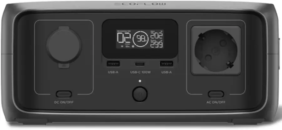 Station d’énergie portable de 299 Wh capable d’alimenter jusqu’à 8 appareils simultanément. Elle propose 2 prises secteur 230 V à onde sinusoïdale pure (600 W, 1200 W en crête), 2 ports USB‑C 100 W, 2 USB‑A charge rapide 18 W, une prise allume‑cigare 12 V/10 A et un chargeur sans fil 15 W, adaptée notamment aux petits appareils, ordinateurs portables ou équipements de loisirs.